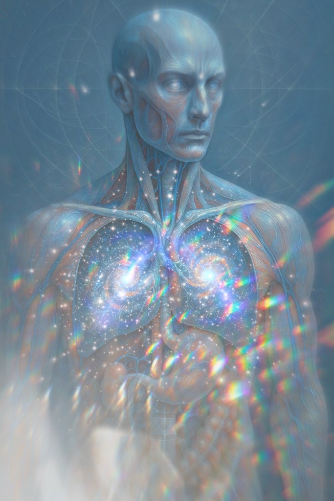 Your body is not just biology. It is a cosmic diagram. Every joint, organ, and curve carries resonance with the greater architecture. You are the universe folded down into a human scale, a portable microcosm carrying the same codes that hold galaxies together.