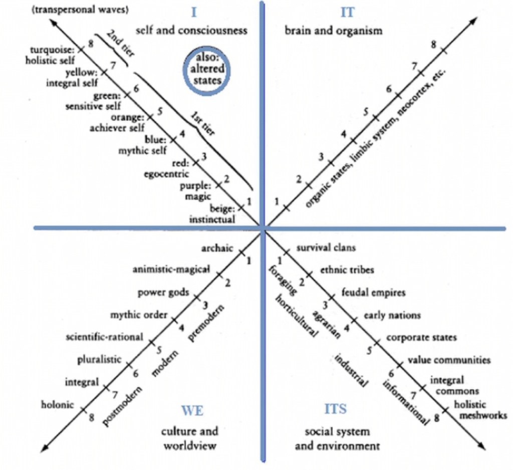 Wilber also explicitly absorbed Spiral Dynamics, a model developed by Clare Graves and popularized by Don Beck and Chris Cowan. Spiral Dynamics describes human values evolving through color-coded stages, from survivalist beige to egocentric red, traditional blue, rational orange, pluralistic green, and beyond. Wilber folded this directly into Integral Theory, situating it as one example of the “levels” dimension. Where Spiral Dynamics focuses on cultural values, Wilber expanded the frame to include cognition, morality, spirituality, and beyond. Yet the inheritance is clear: Integral Theory’s developmental arc is inseparable from Graves’s original insight that values evolve in predictable waves.